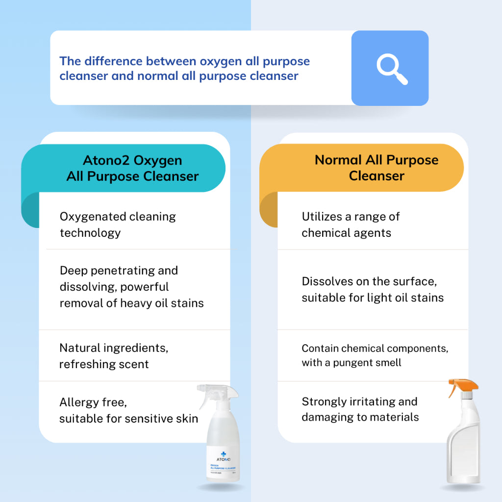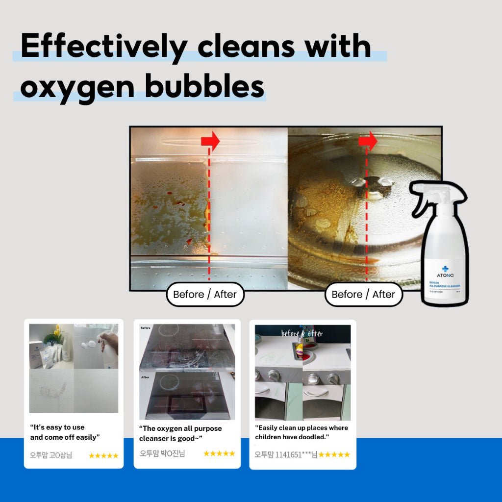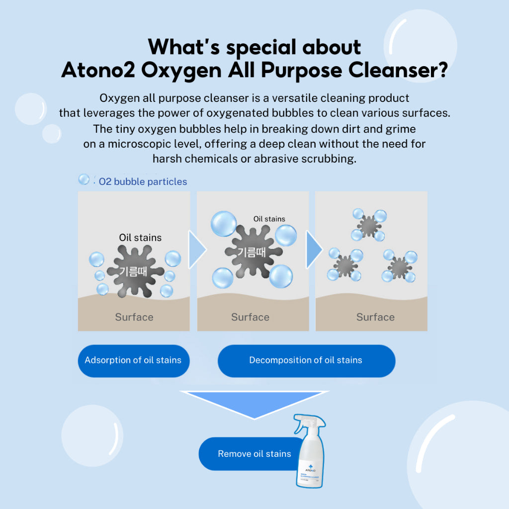 Atono2 Oxygen All Purpose Cleanser that powerfully breaks down and removes stubborn stains, and sticky or greasy residues from grease stains, with a rich, fast lather that cleans easily in just minutes! Nourish the surface to keep your surface clean and fresh!