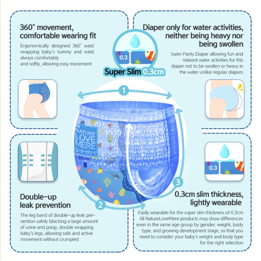 Specially designed for baby’s play time in the water with no worries on leakage.