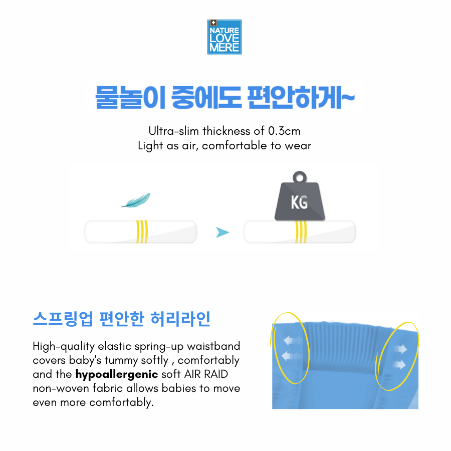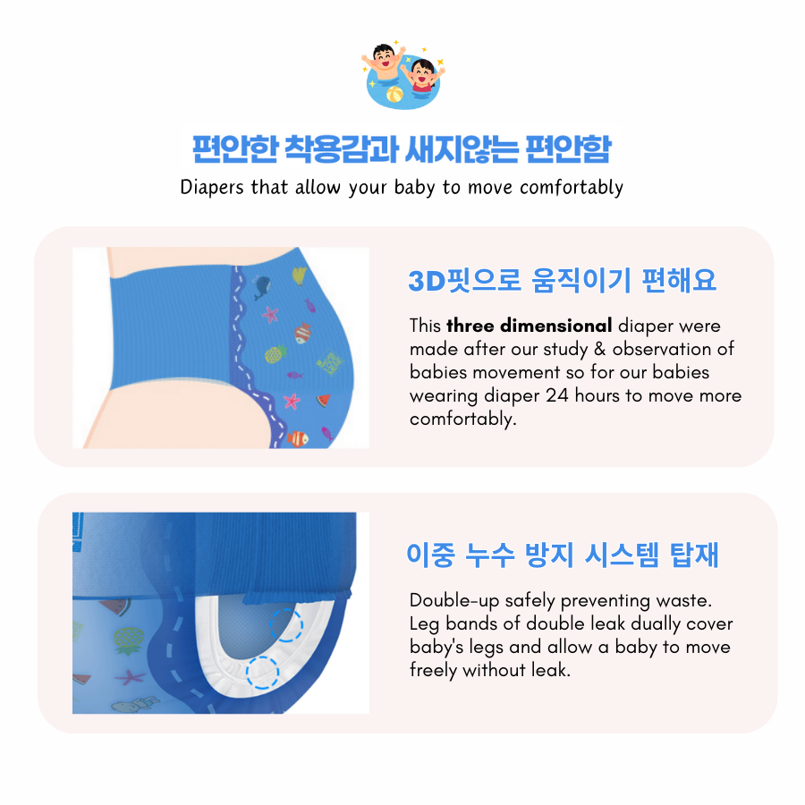 Double up leak prevention with hypoallergenic soft AIR RAID non-woven fabric allows babies to move even more comfortably.